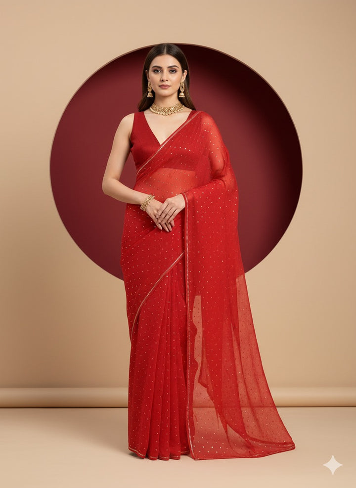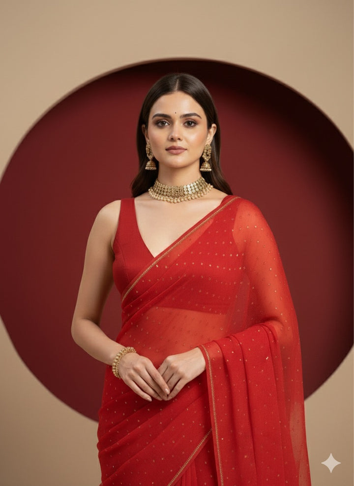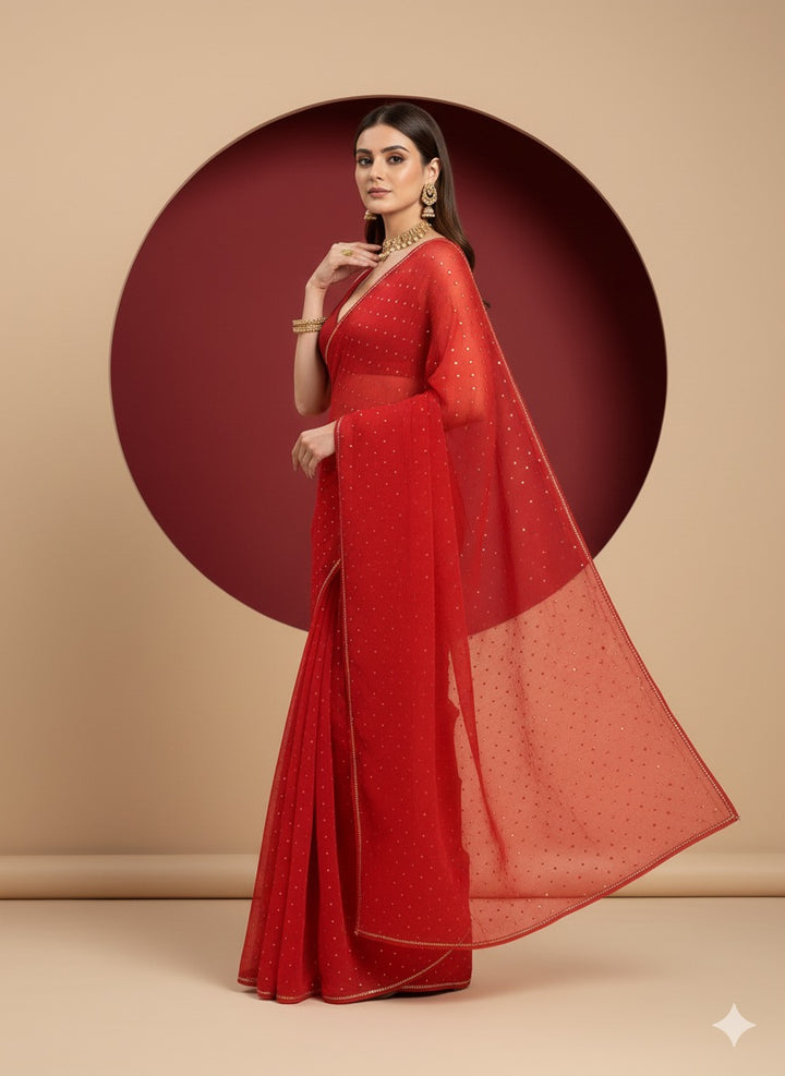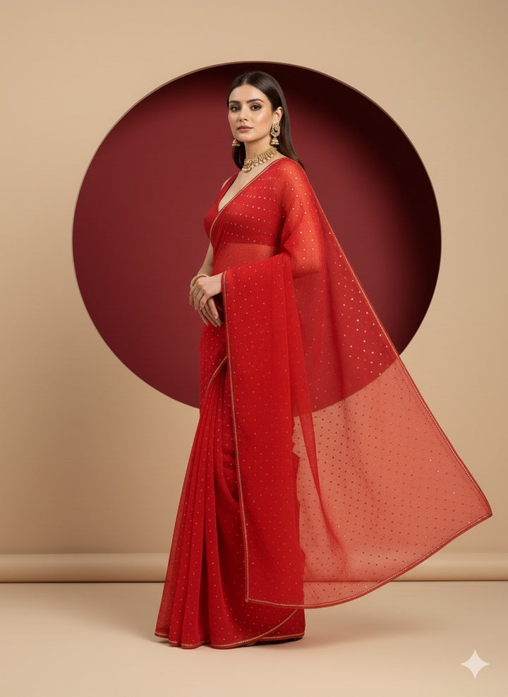 A celebration of tradition and sparkle, this red pure georgette saree is adorned with intricate mukaish work that shimmers with every move.