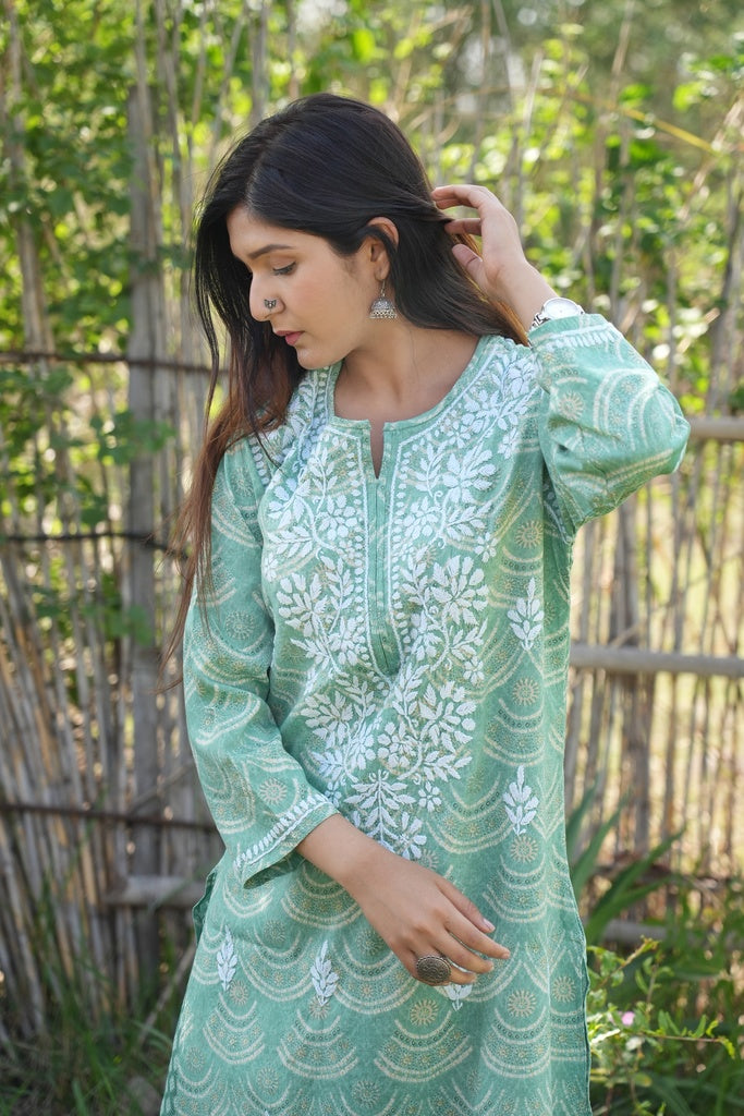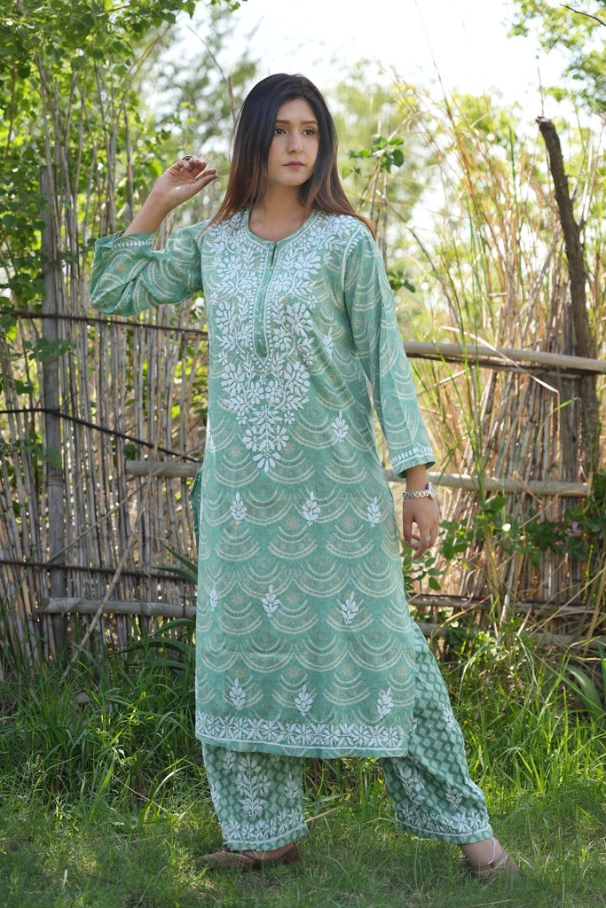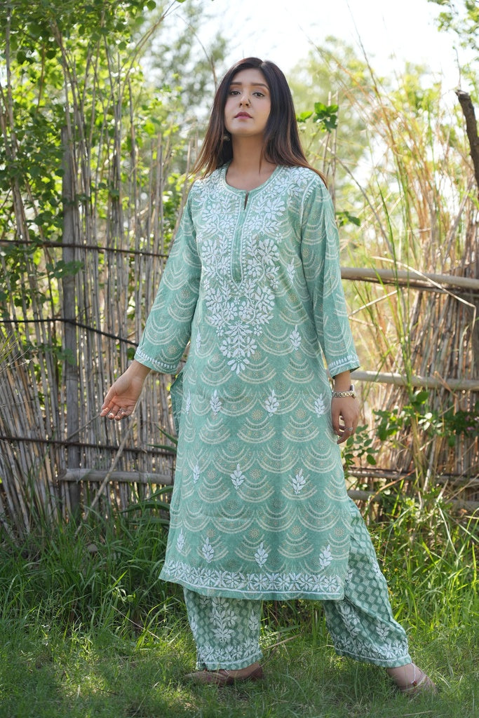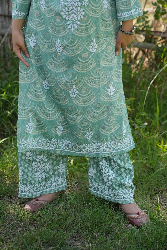 Shiza Printed chikankari kurti and plazzo set in Sea Green